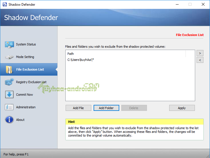 Ada fiture Exclusion List dimana, kita dapat memberikan pengecualian terhadap folder atau file yang ingin tidka kita proteksi. bahkan registry Exclusion pun di sediakan fiture nya oleh software Shadow Defender 1.5.0.727 full version terbaru ini.